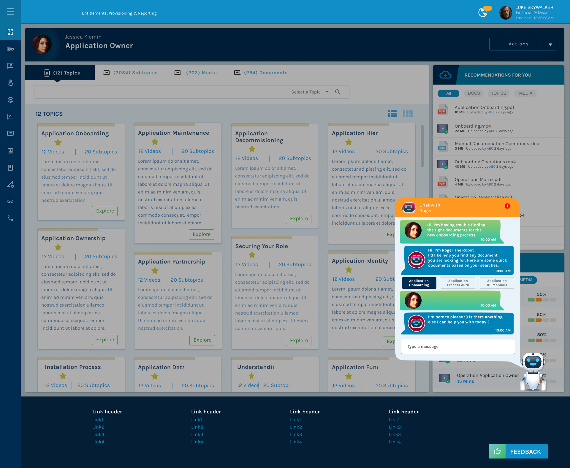 Create a user-friendly document management system that helps users organize and access documents. Use an interactive assistant named “Roger the Robot” to guide users during searches. Improve the user experience with an engaging interface.